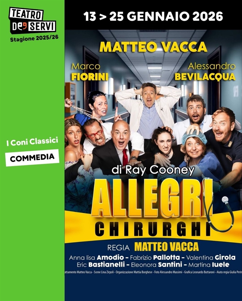 Politeama SrlpresentaGLI ALLEGRI CHIRURGHIdi Ray Cooneyregia di Matteo Vaccacon Matteo Vacca, Marco Fiorini, Alessandro Bevilacqua, Fabrizio Pallotta, Annalisa Amodio, Erik Bastianelli, Martina Iuele,...